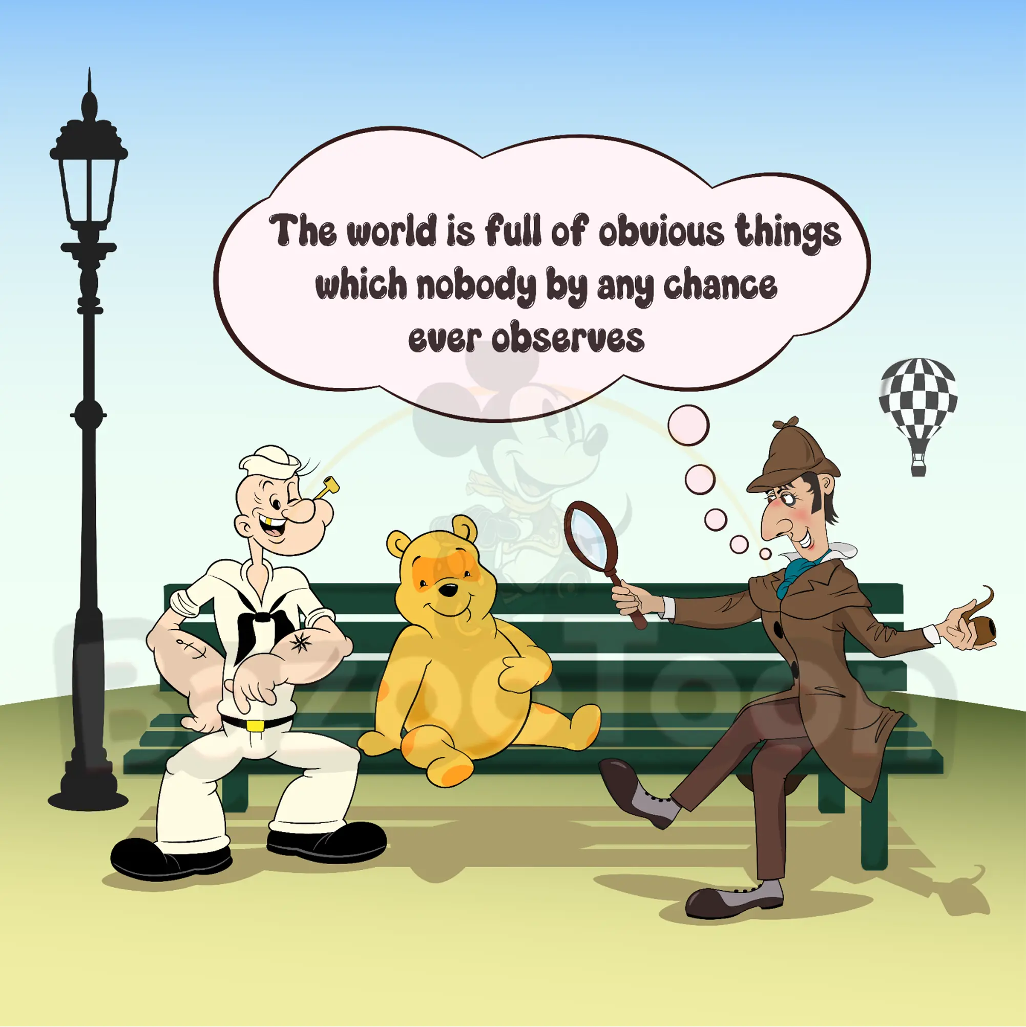 Each piece in this pack highlights a different mood. Ze Mickey vs Tintin Trump shows a sharp and modern scene. It plays with contrast and humor, which makes the artwork stand out. Winnie Bear Laokoon reimagines a famous sculpture in a light-hearted way. The dynamic poses, bright details, and strong shapes create a dramatic yet playful look. Finally, Sherlock, Winnie and Popeye – Bench Scene