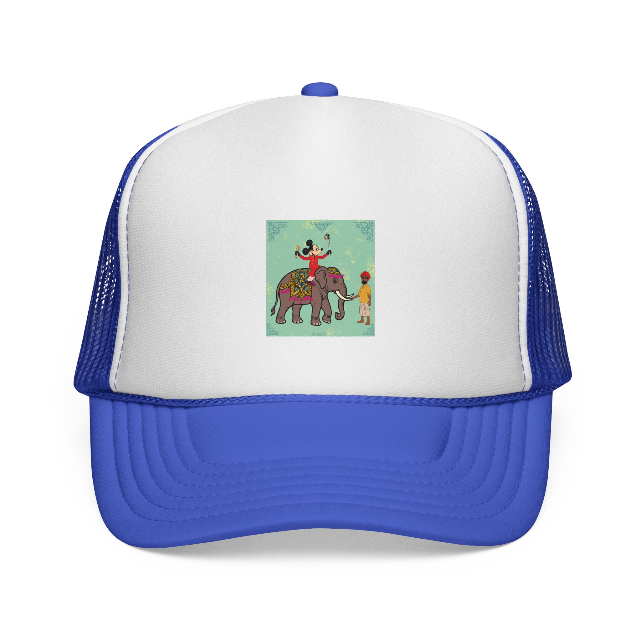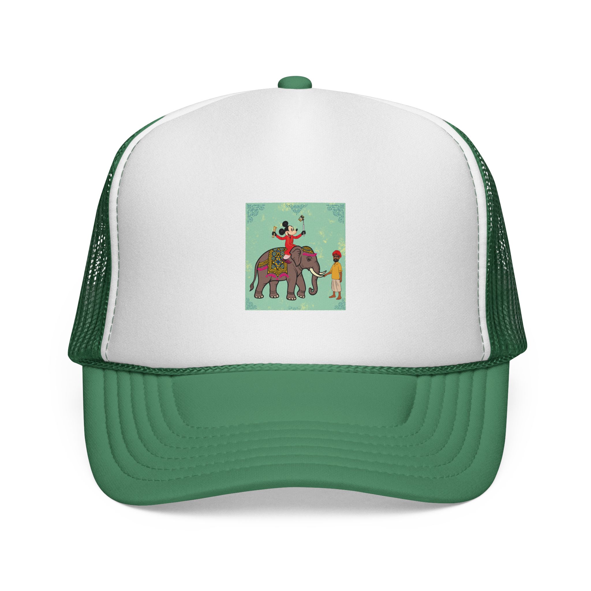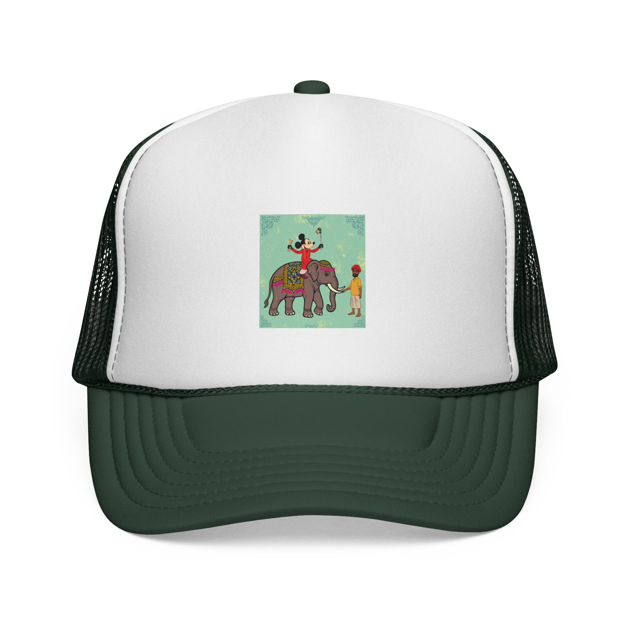 Mickey trades Main Street for the Maharaja route, riding high on a royal elephant draped in velvet and gold. One hand holds a selfie stick, the other a rolled delicacy — proof that even legends love a good photo op and a snack. Below, his guide watches in quiet amusement, unfazed by the latest influencer of the empire.