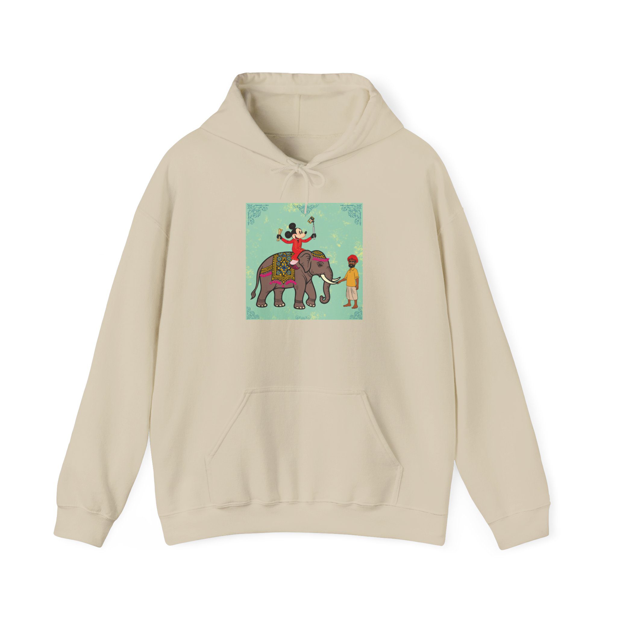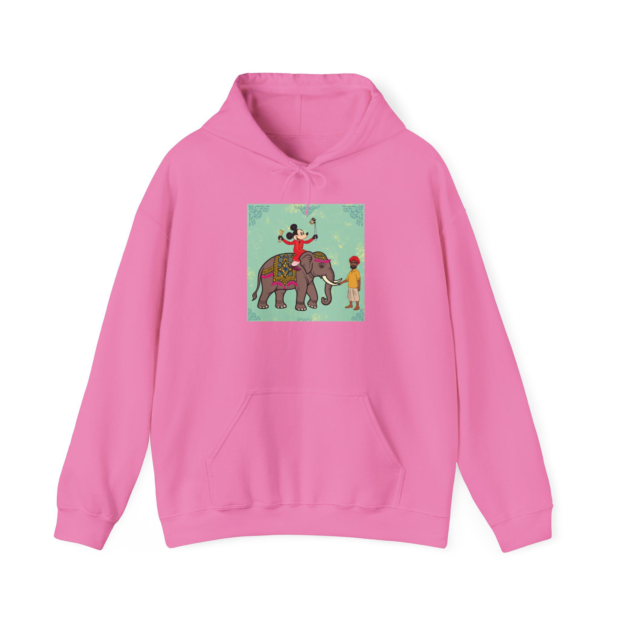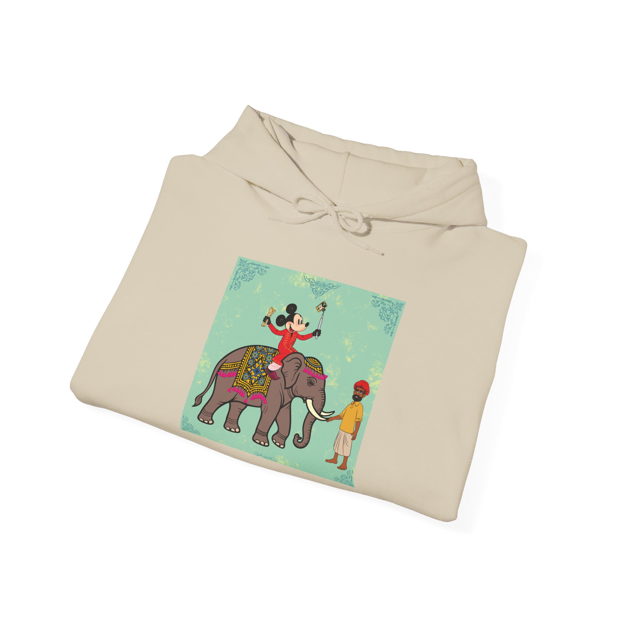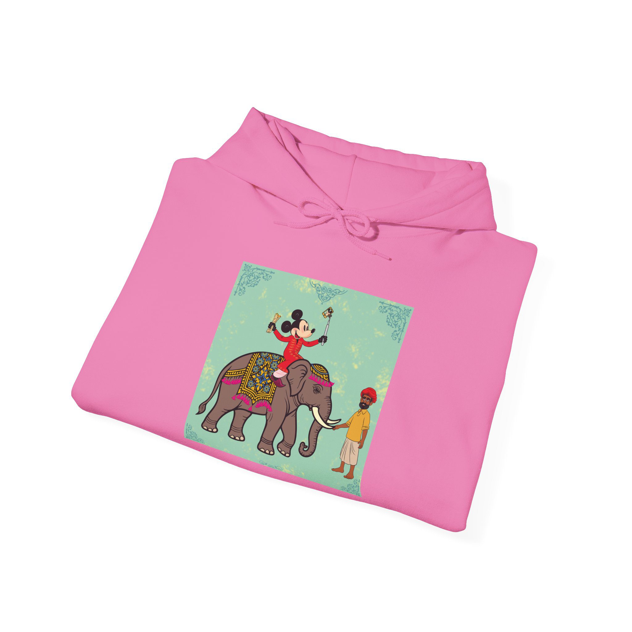 Retro Cartoon Hero trades Main Street for the Maharaja route, riding high on a royal elephant draped in velvet and gold. One hand holds a selfie stick, the other a rolled delicacy — proof that even legends love a good photo op and a snack. Below, his guide watches in quiet amusement, unfazed by the latest influencer of the empire.