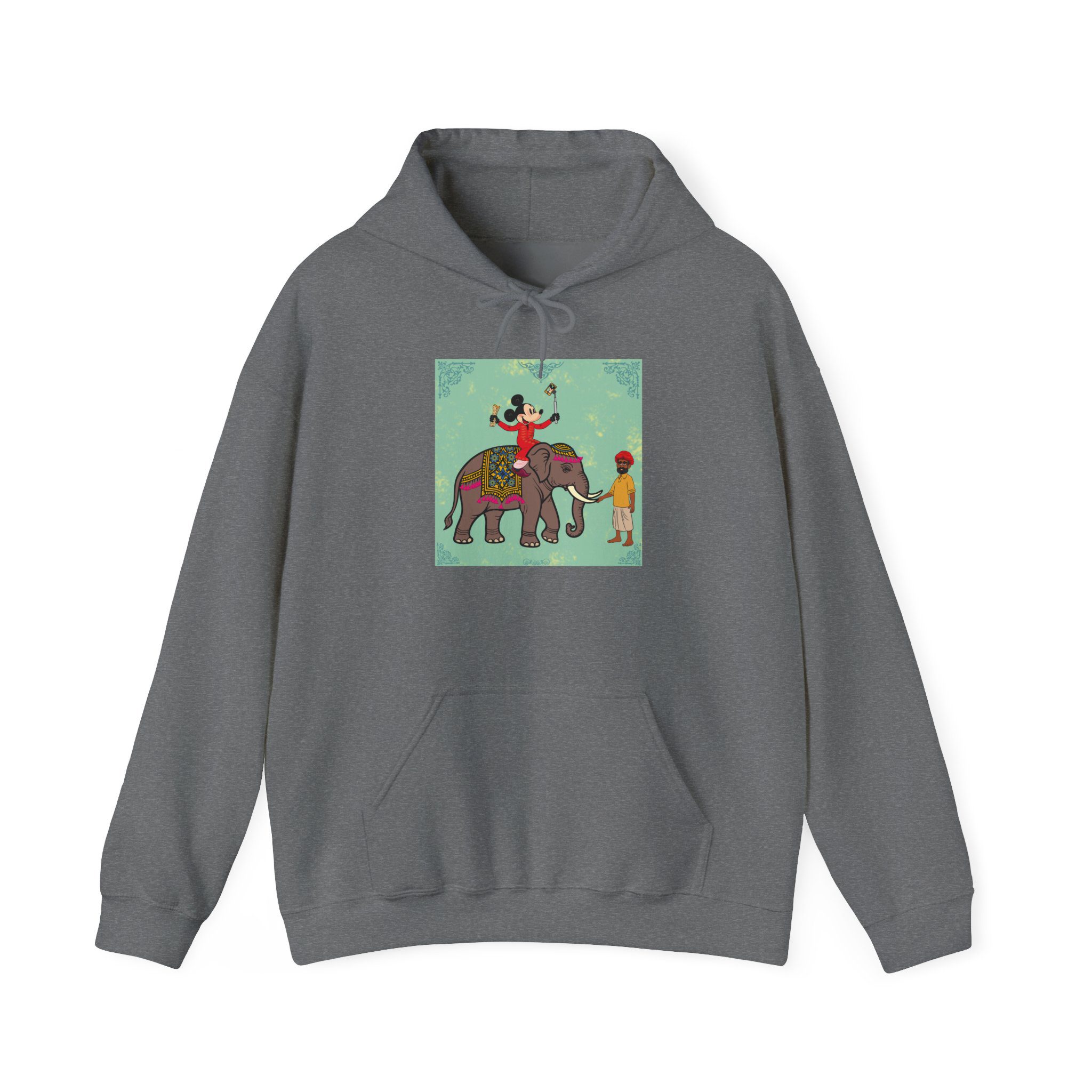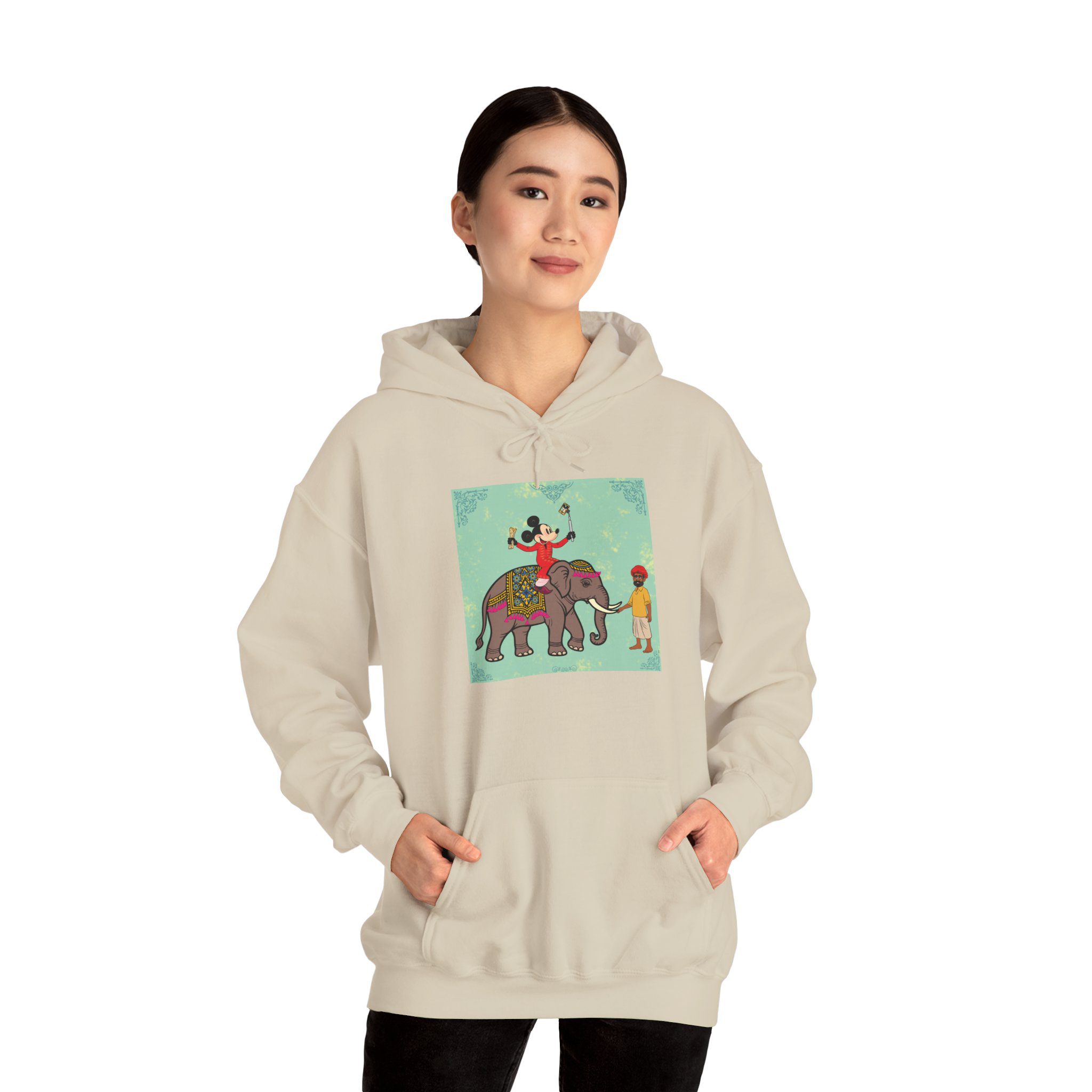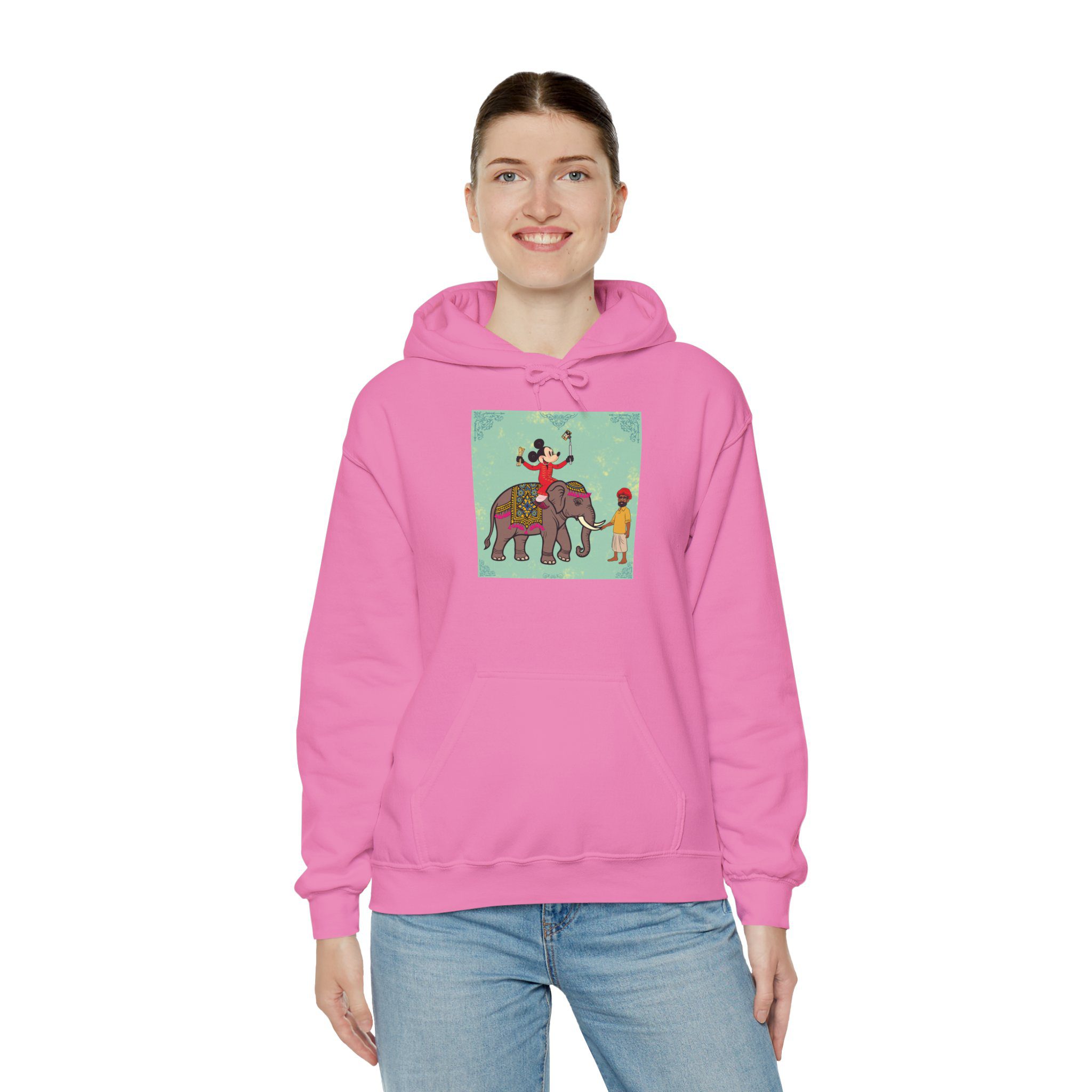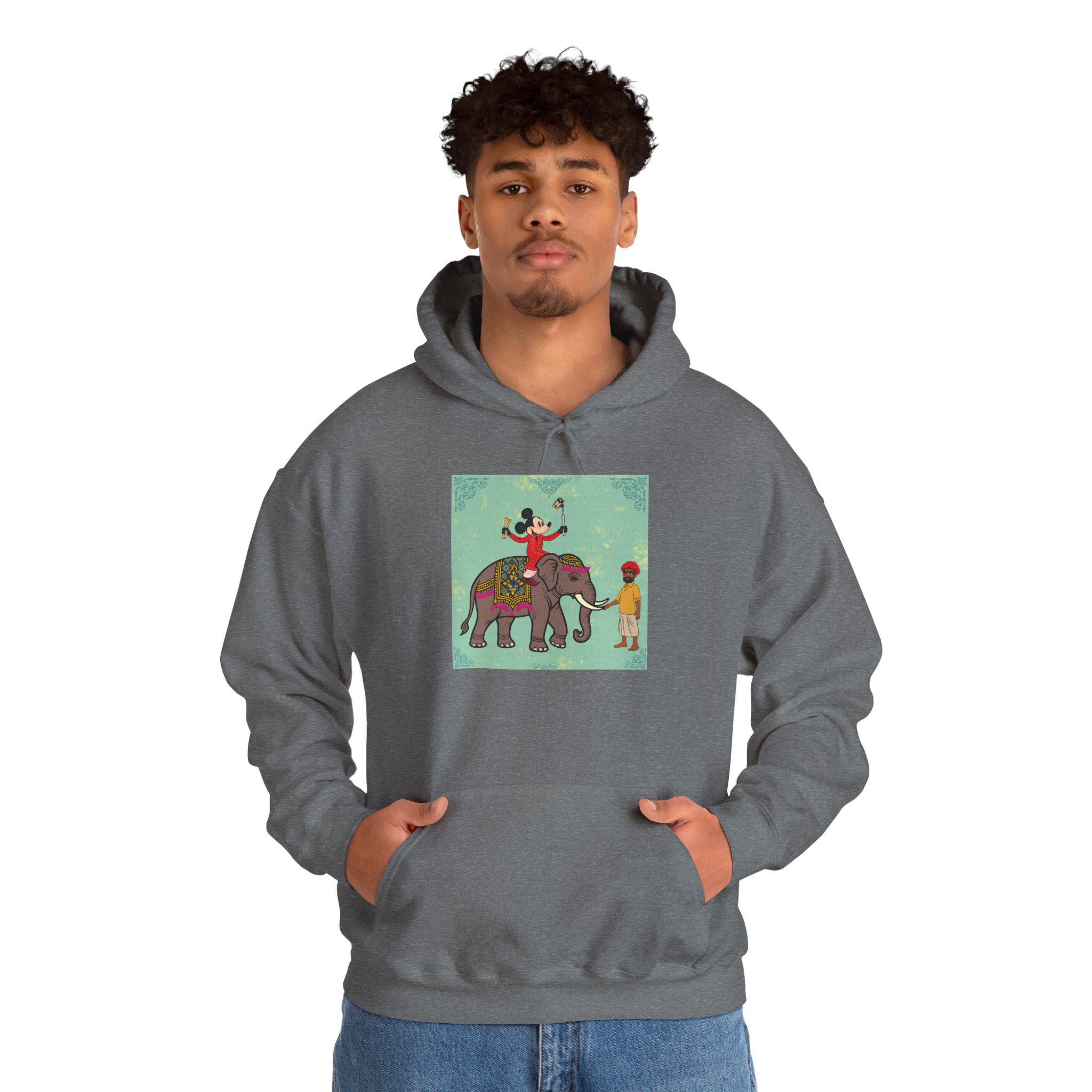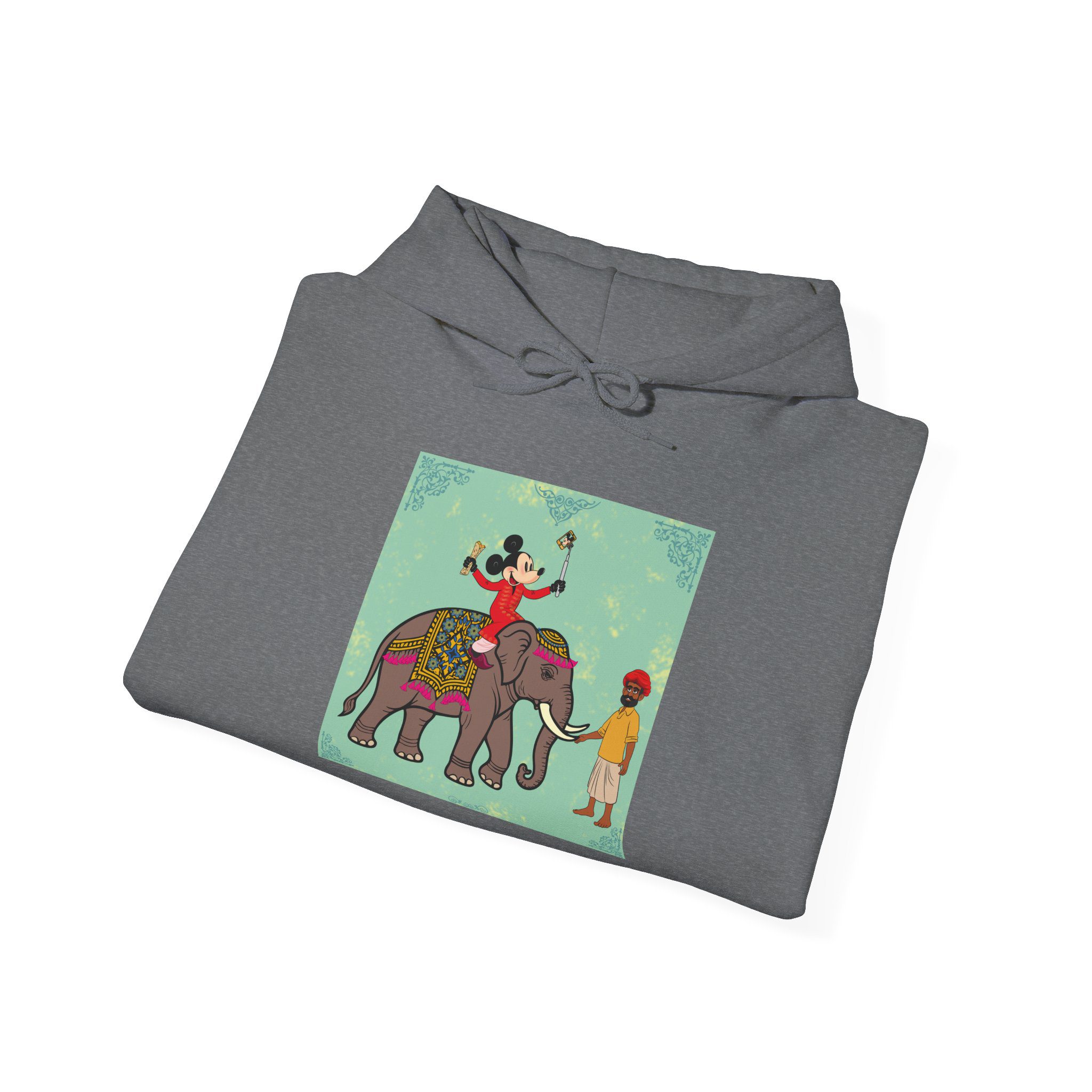 Retro Cartoon Hero trades Main Street for the Maharaja route, riding high on a royal elephant draped in velvet and gold. One hand holds a selfie stick, the other a rolled delicacy — proof that even legends love a good photo op and a snack. Below, his guide watches in quiet amusement, unfazed by the latest influencer of the empire.