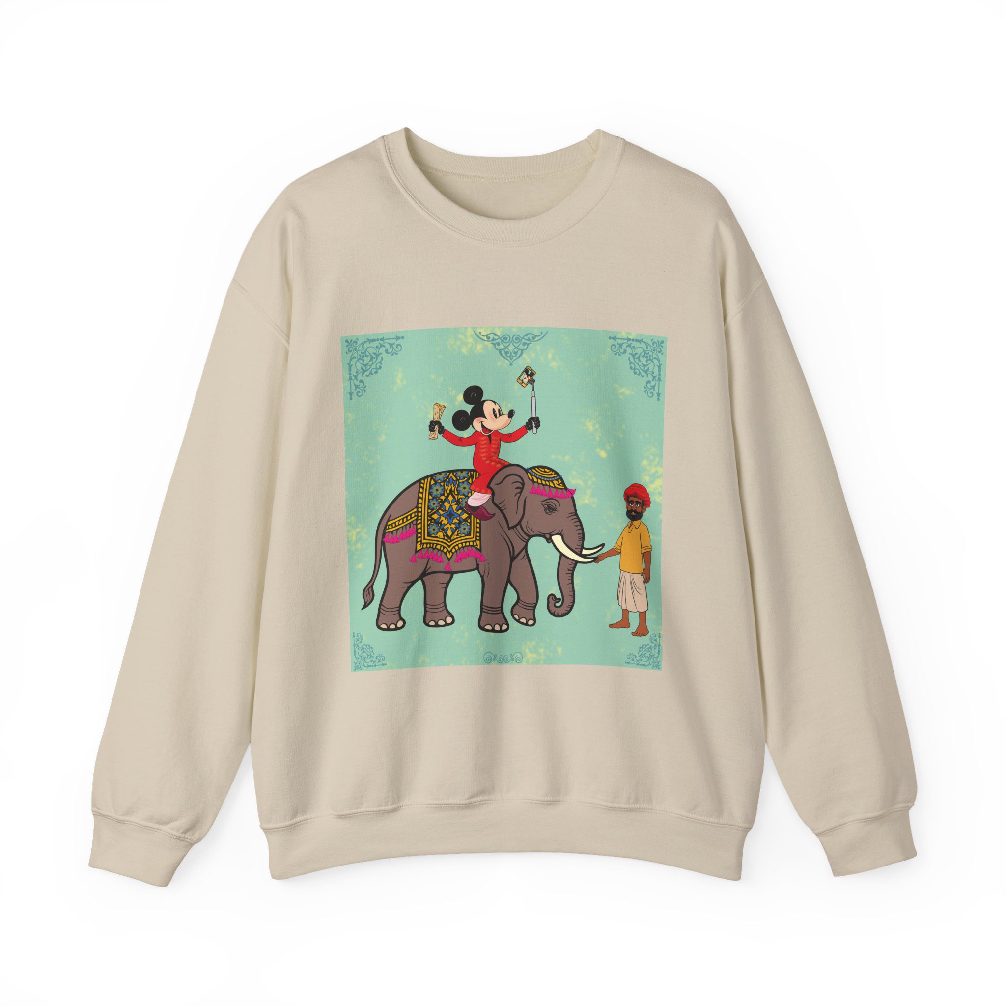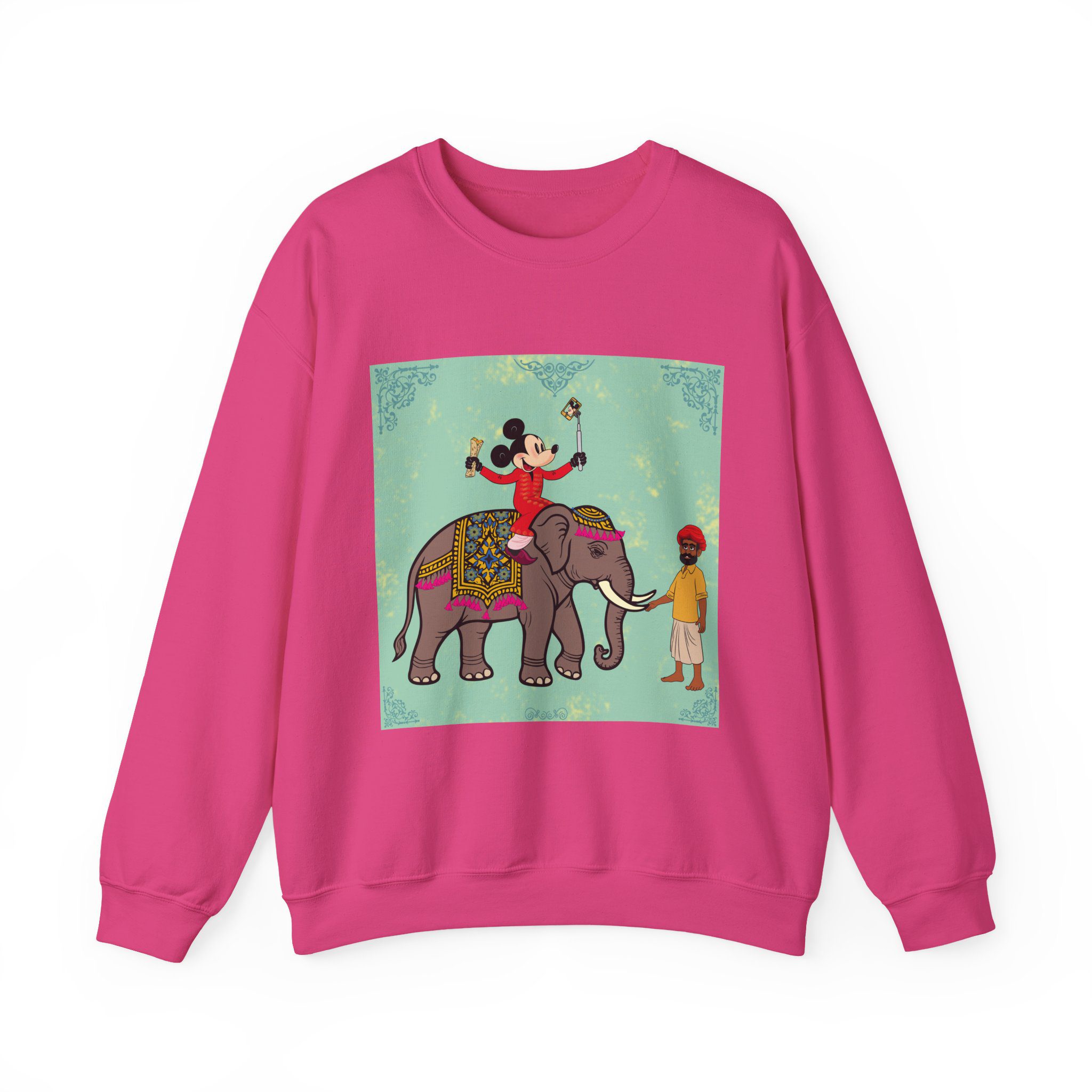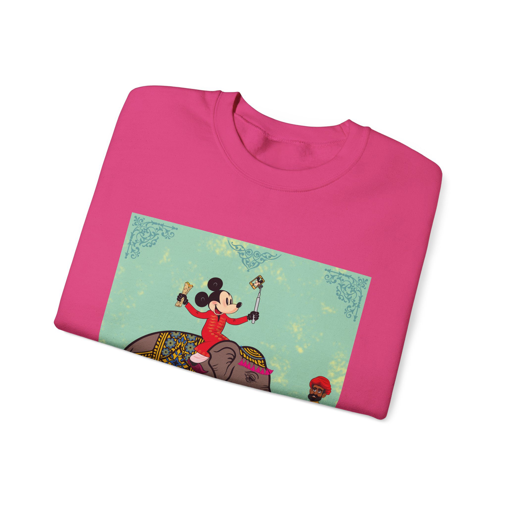 Retro Cartoon Hero trades Main Street for the Maharaja route, riding high on a royal elephant draped in velvet and gold. One hand holds a selfie stick, the other a rolled delicacy — proof that even legends love a good photo op and a snack. Below, his guide watches in quiet amusement, unfazed by the latest influencer of the empire.