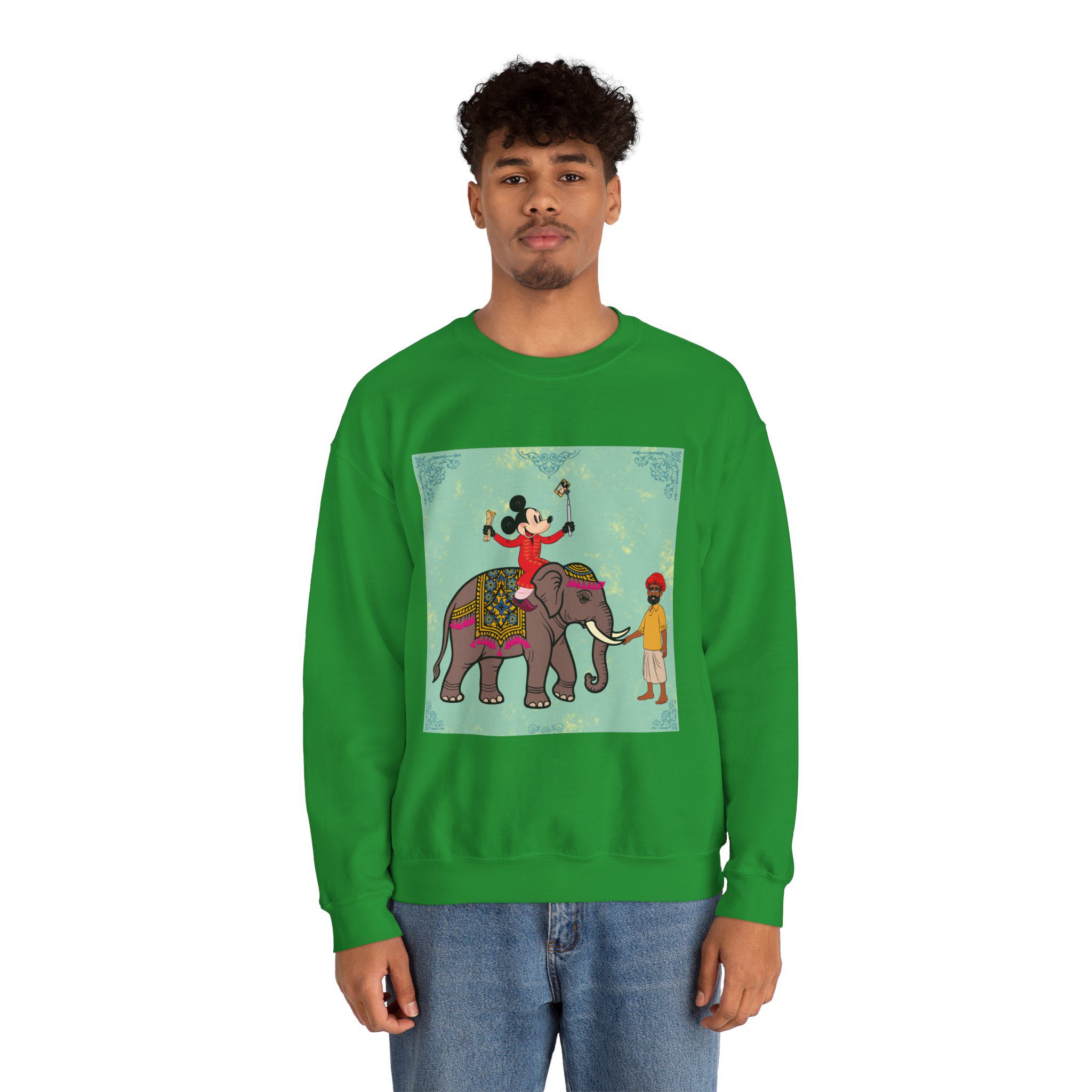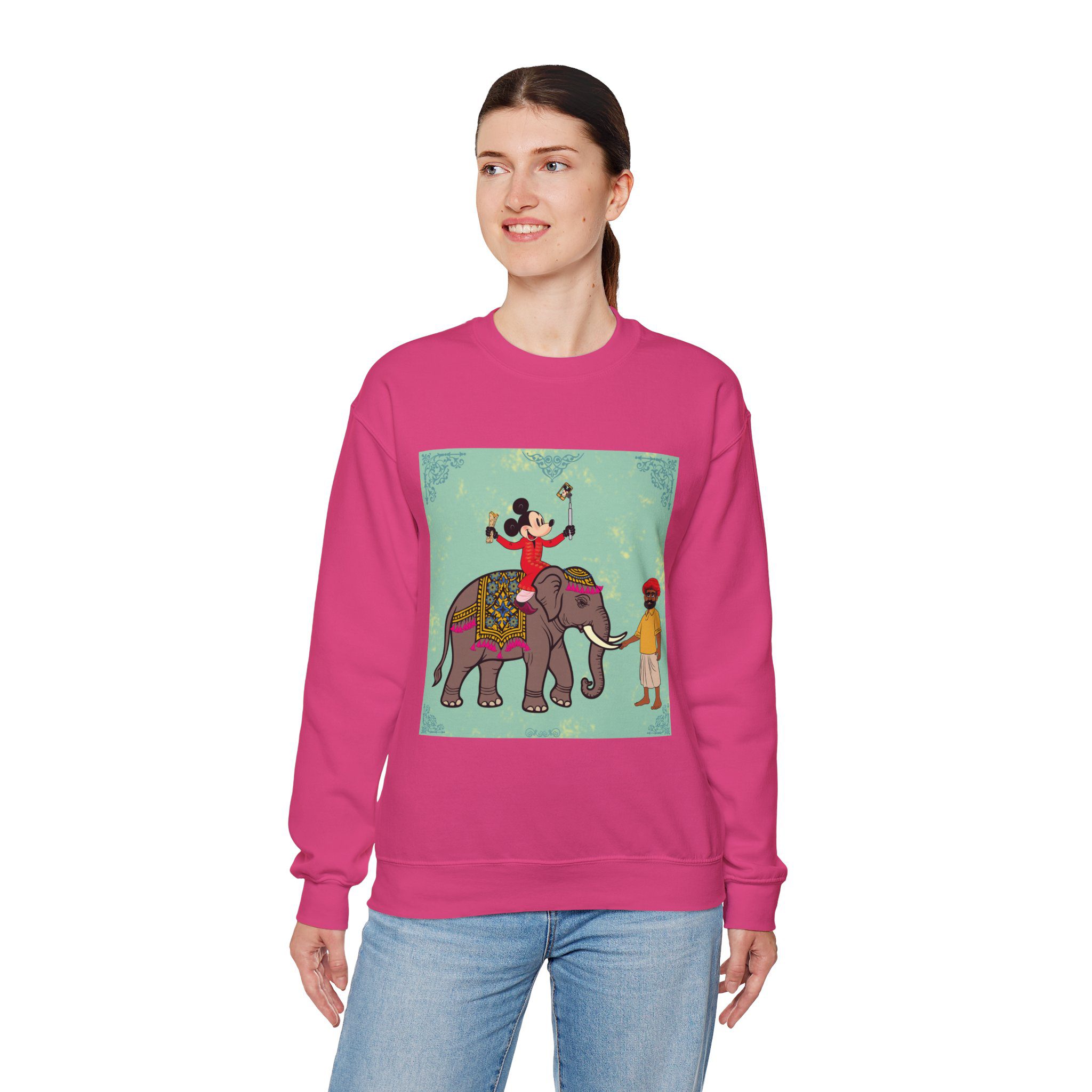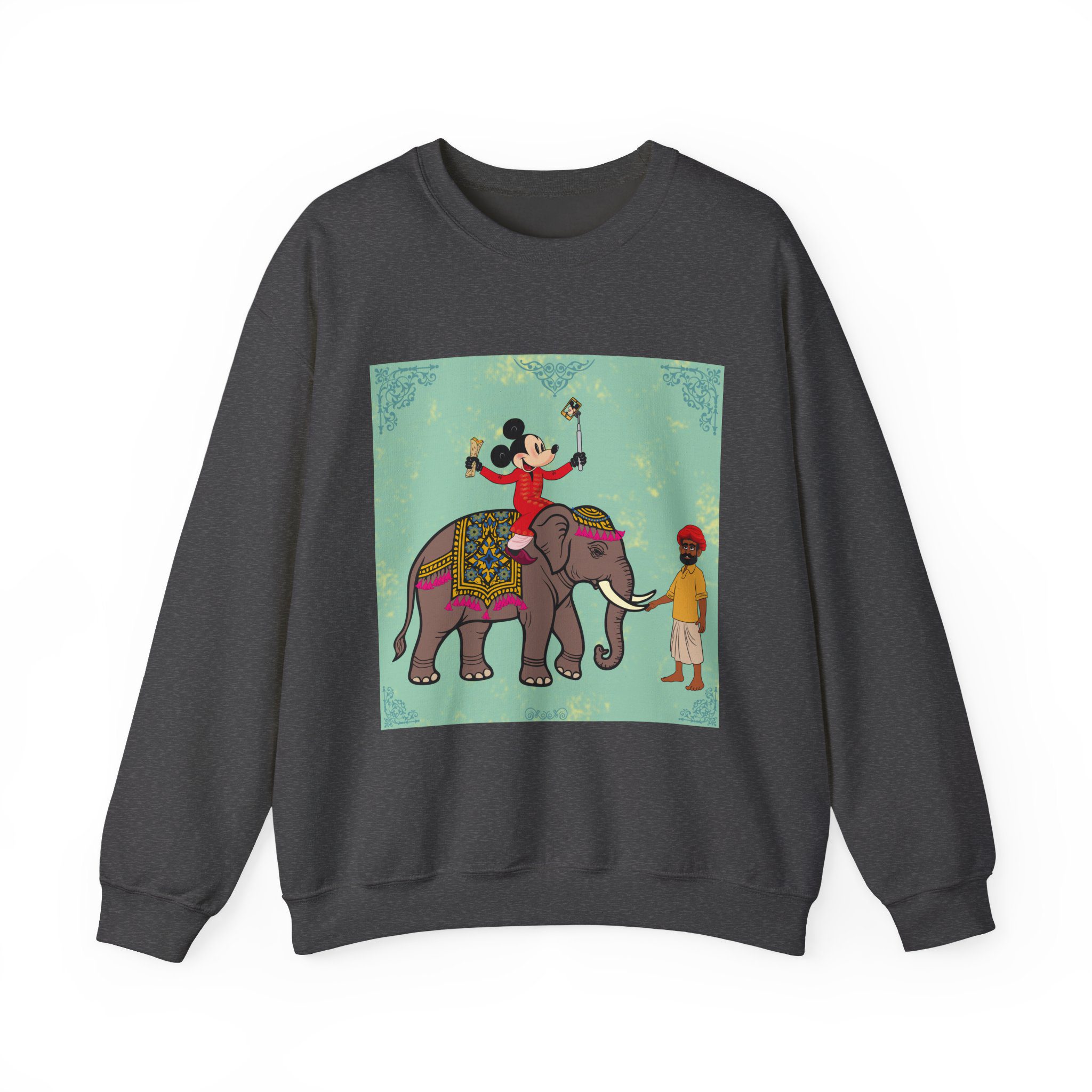Retro Cartoon Hero trades Main Street for the Maharaja route, riding high on a royal elephant draped in velvet and gold. One hand holds a selfie stick, the other a rolled delicacy — proof that even legends love a good photo op and a snack. Below, his guide watches in quiet amusement, unfazed by the latest influencer of the empire.