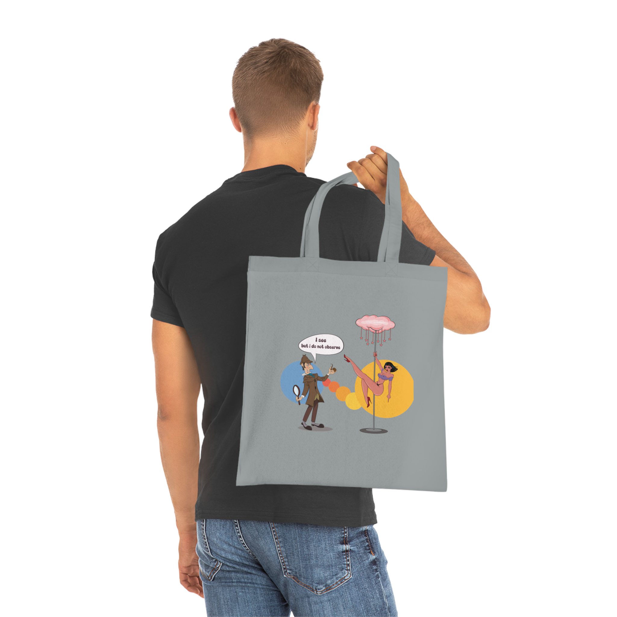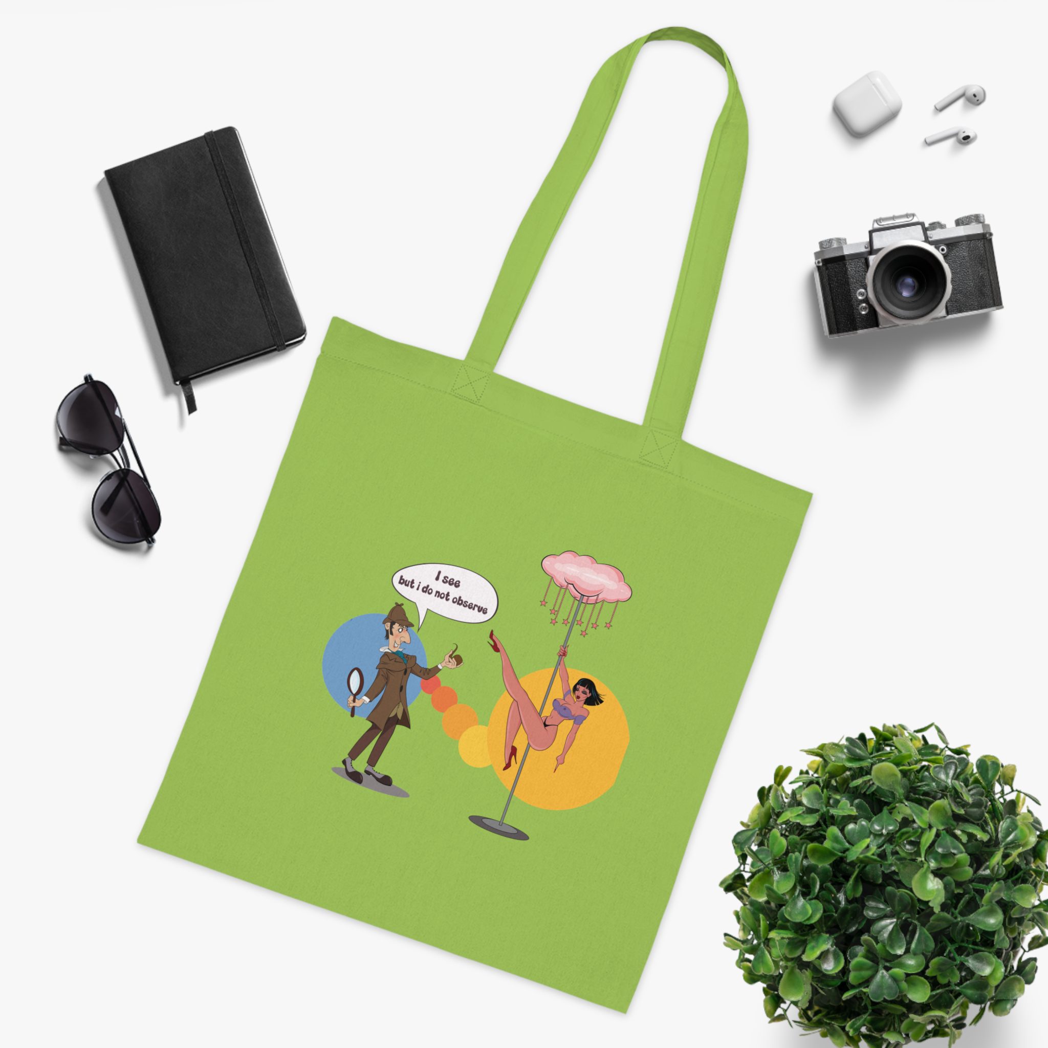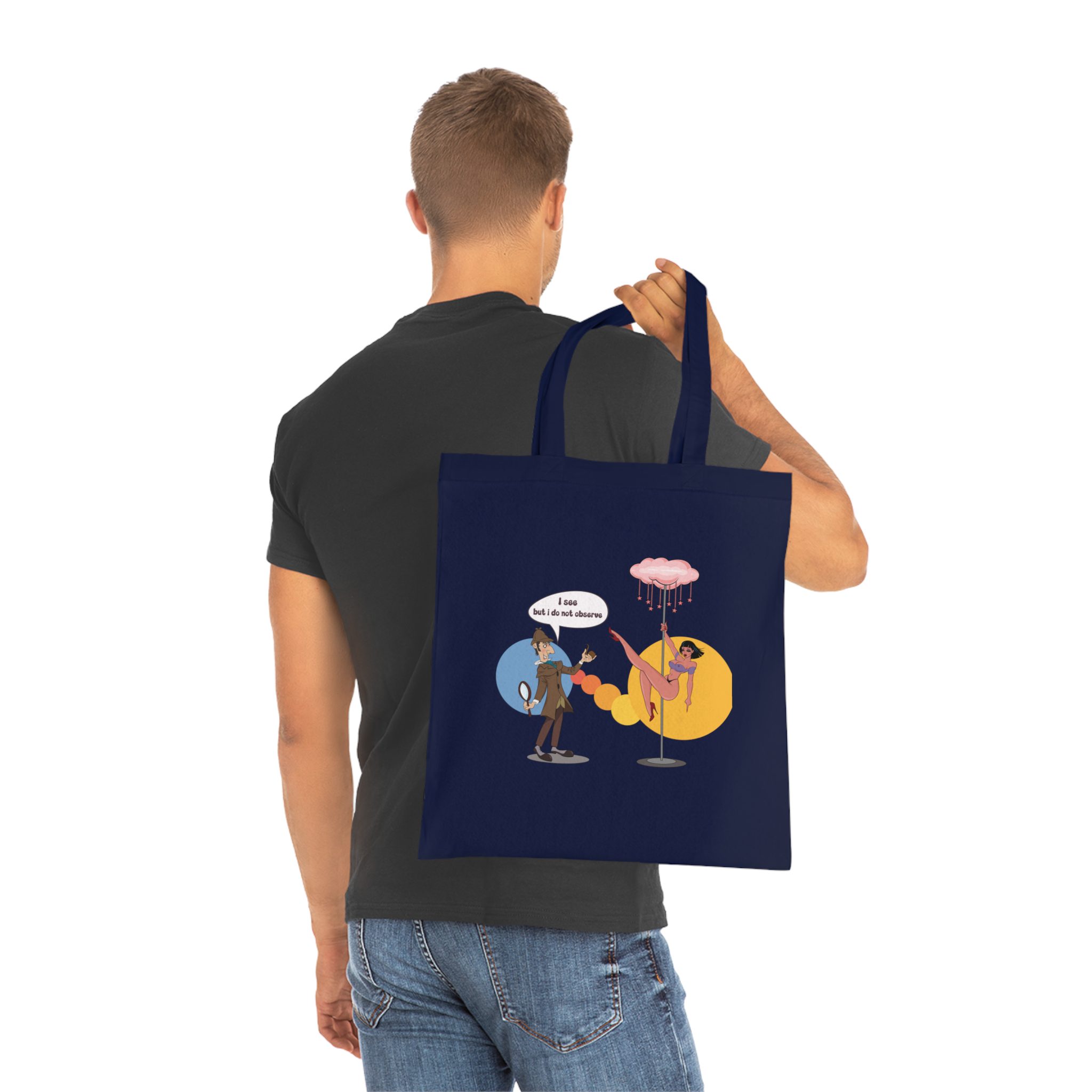 Even the keenest detective can lose focus sometimes. This Sherlock at the Sherlock at the Neon Lounge Bag places the legendary sleuth in a scene he definitely didn’t see coming. With his iconic line given a cheeky twist, the design blends wit, irony, and bold humor — perfect for fans of clever satire and delightfully unexpected storytelling.