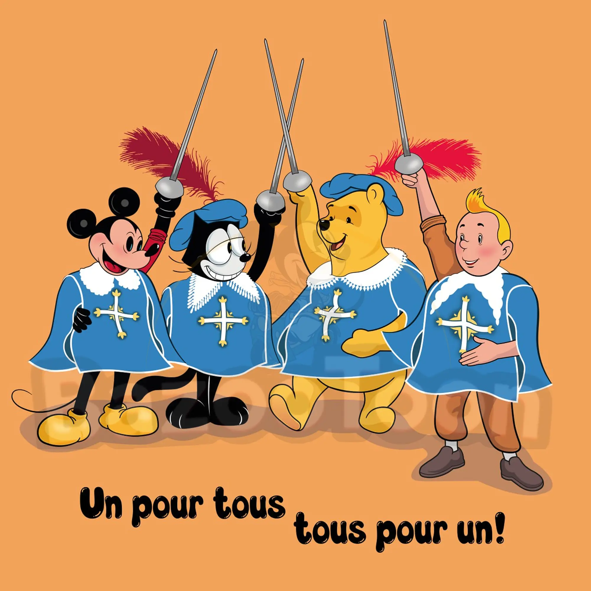 The design is ideal for fans of crossovers and light-hearted storytelling. People who enjoy animated classics will recognize each character instantly. Yet this musketeer twist gives them a new, heroic personality. The composition celebrates companionship, courage, and a sense of play. It also brings Alexandre Dumas’ famous motto, “Un pour tous, tous pour un!”, into a fun and animated world. As a result, the illustration works well for anyone who appreciates art that mixes tradition with humor.